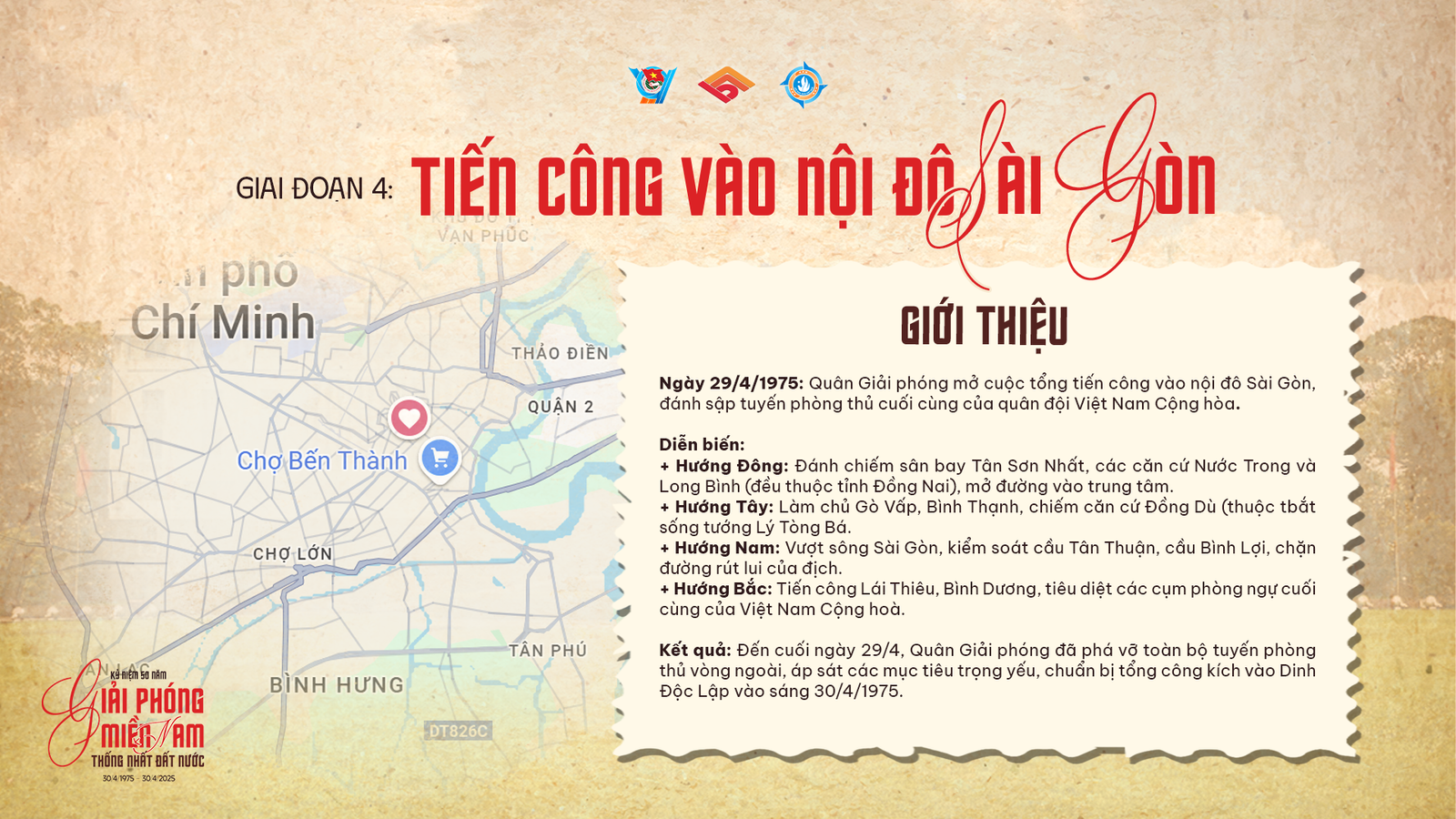 Diễn biến: Hướng Đông: Đánh chiếm sân bay Tân Sơn Nhất, căn cứ Nước Trong và Long Bình (đều thuộc tỉnh Đồng Nai), mở đường vào trung tâm. Hướng Tây: Làm chủ Gò Vấp, Bình Thạnh, chiếm căn cứ Đồng Dù (thuộc bắt sống tướng Lý Tòng Bá). Hướng Nam: Vượt sông Sài Gòn, kiểm soát cầu Tân Thuận, cầu Bình Lợi, chặn đường rút lui của địch. Hướng Bắc: Tiến công Lái Thiêu, Bình Dương, tiêu diệt các cụm phòng ngự cuối cùng của Việt Nam Cộng hoà.