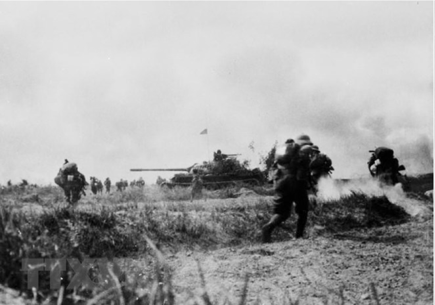 Lực lượng xe tăng và bộ binh Sư đoàn 320 đánh chiếm căn cứ Đồng Dù (Củ Chi), sáng 29-4-1975, mở cánh cửa thép Tây Bắc Sài Gòn để quân ta thọc sâu đánh chiếm sân bay Tân Sơn Nhất và Bộ Tổng tham mưu ngụy quyền Sài Gòn. Ảnh: Tư liệu/TTXVN.