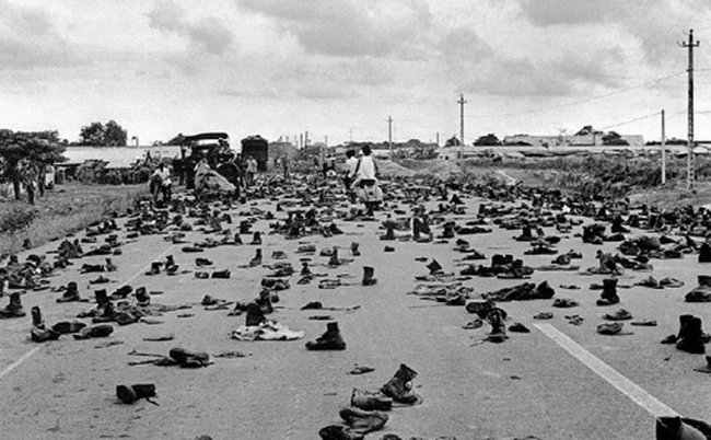 Binh lính VNCH vứt hết mũ áo giày dép trên đường tháo chạy. Ảnh: Tư liệu